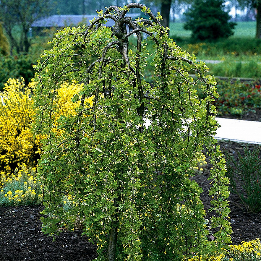 Листья акации желтой пендулы штамб ярко-зеленые весной, зеленые летом и зелено-желтые осенью, что добавляет разнообразие и красок в ваш ландшафт. Цветки желтого оттенка появляются в мае-июне, придавая растению неповторимый вид и привлекая бабочек и пчел.