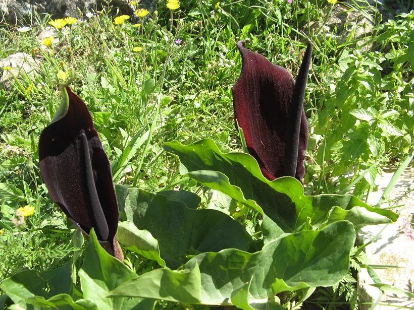 • Стебли мясистые с пятнами коричневого цвета. Из-за этих коричневых пятен создается эффект змеиной кожи. Соцветие на стебле появляется в начале лета и представляет собой початок с покрывалом. Покрывало - волнистое по краям и его длина 45 см. Оно бледно-зеленое снаружи, а внутри – пурпурно-багровое. Початок тоже 45 см, а цвет темно-красный.