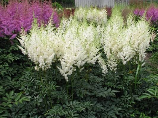 Рассада астильбы Арендса Клоуз Хармони (Close Harmony) летом порадует вас эффектным цветением, как будто в летнем саду застыл белоснежный фонтан. Бледные черешки, густо усыпанные мелкими белыми цветами с легким кремовым оттенком, смотрятся свежо и привлекательно. Форма крон напоминает асимметричные ромбы. Период цветения: июль-август. Листва декоративна сама по себе, благодаря изумрудному оттенку с мраморными полосами. Высота взрослого многолетника достигает 80 см. Сорт завязывает семенные коробочки. Устойчив к заболеваниям и хорошо зимует под снежным укрытием. В регионах с бесснежными зимами растения необходимо прикрывать дышащим материалом. Особенности посадки астильбы Клоуз Хармони: