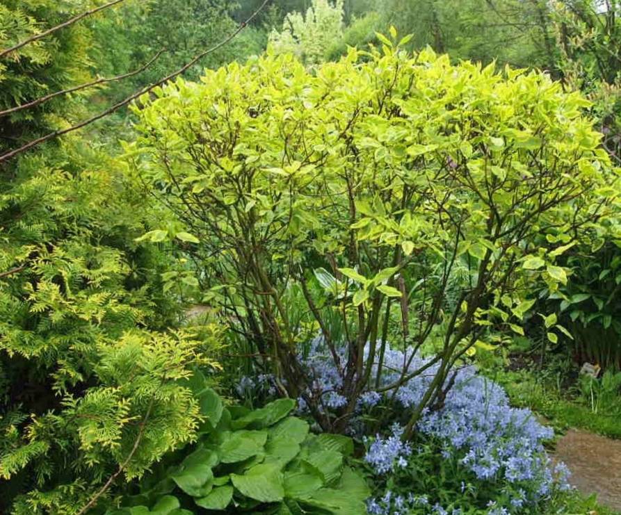 - цветет белыми щитковидными соцветиями. Саженцы белого дерена Гоучаулти лучше высаживать на солнечных участках, так как в тени цвет листвы тускнеет.