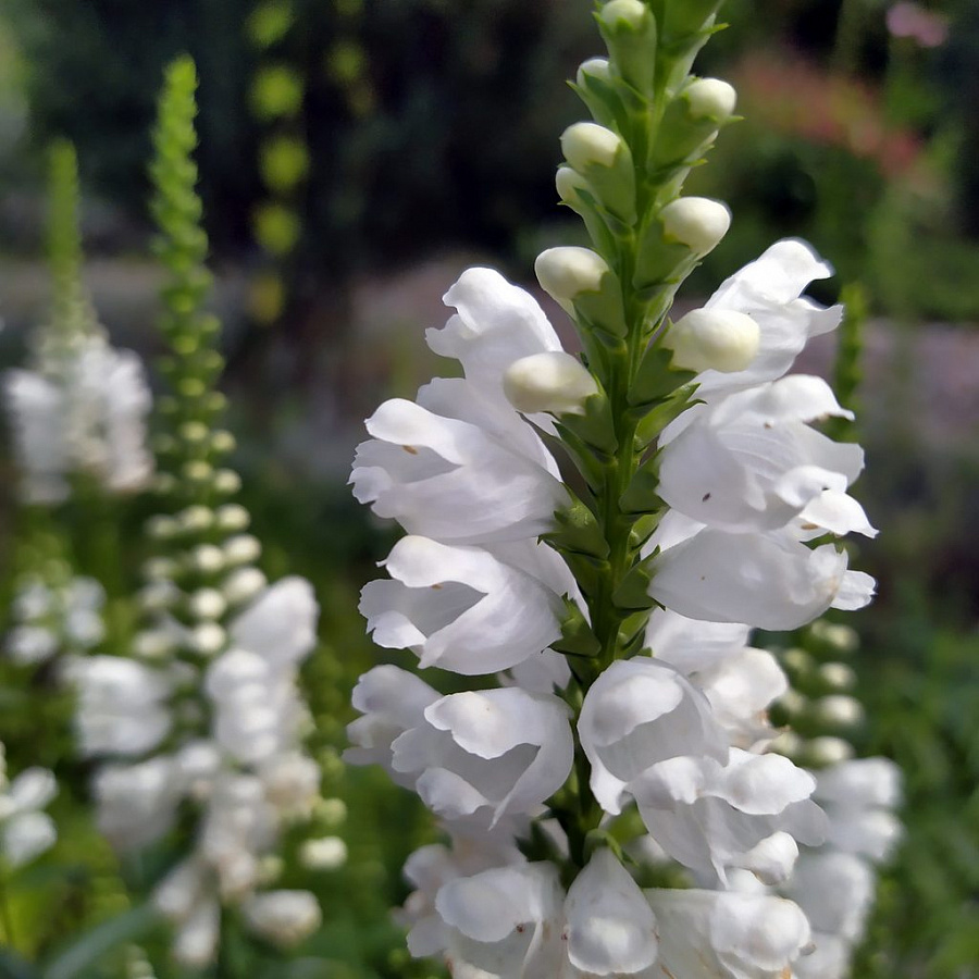 Рассада физостегии Кристал Пик Вайт (Crystal Peak White) имеет прямостоячие, крепкие, четырехгранные стебли и вырастает около 80 см в высоту. Период цветение происходит в июле-августе. Цветочки беленького окраса собраны в колосовидное соцветие. Достоинства физостегии Кристал Пик Вайт: