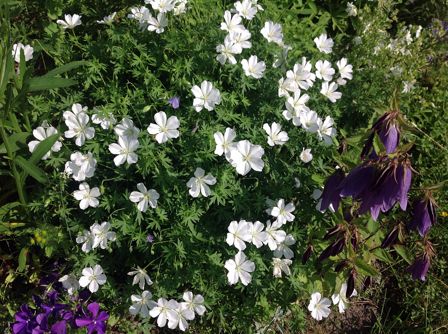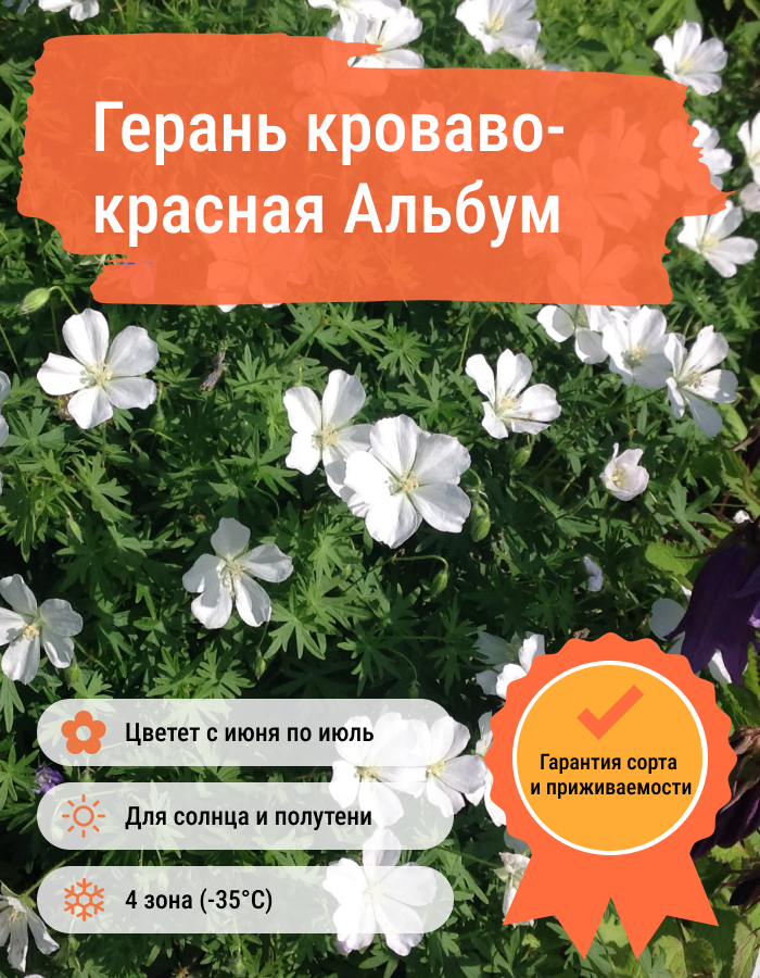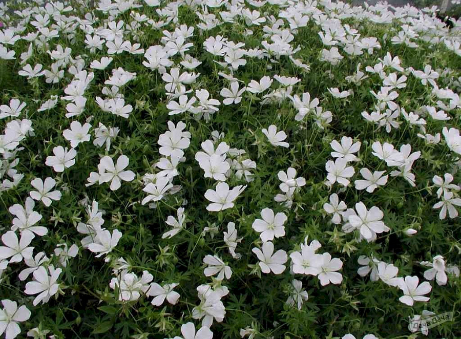 Саженцы герани кроваво-красной Альбум (Geranium sanquineum Album) разрастаясь, образуют пышные кустики красивой сферической формы, усыпанной нежными белыми цветочками.
