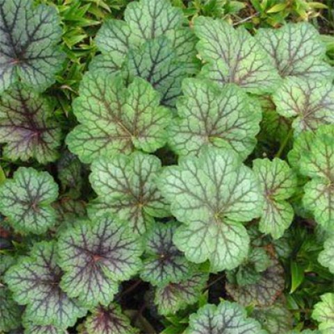 Рассада гейхеры Дэйл Стрейн (Dale Strain) поражает эффектным внешним видом. Поверхность листьев покрыта темными прожилками, контрастно выделяющимися на серебристо-зеленом фоне. В июле розетка выпускает стебель с зеленоватыми цветочками. Этот сорт применяют для украшения клумб, альпийских горок и водоемов.