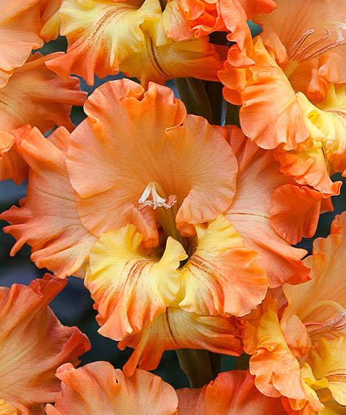 Луковицы гладиолуса гибридного Princess Frizzle высаживают в глубокие лунки на расстоянии до 25 см друг от друга. Участок для растения выбирают хорошо освещенный или частично затененный, с питательной, рыхлой почвой, без застоя влаги. Дополнительно место должно быть защищенным от ветра. Цветет культура апельсиново-оранжевым цветками с более темной по тону окантовкой и желтыми лепестками у основания. Особенно очаровательно такое растение смотрится в групповых посадках по 5-10 штук. Гладиолусы гибридные Princess Frizzle используют в одиночных посадках на газоне, различных смешанных цветниках и для выращивания на срез.