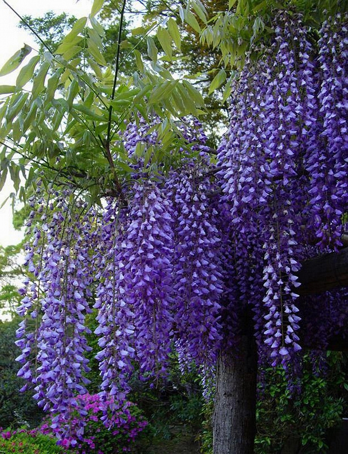 Саженцы глицинии китайской вырастут в прочные лианы, которые во время цветения превращаются в яркие водопады красочных соцветий. Сад с цветущими глициниями – незабываемое райское зрелище. Длина крупномера может достигать больше 20 м. Листва очень изящная, перистая. Свисающие соцветия, длиной до 35 см, усеяны мелкими воздушными цветками. Цветы глицинии китайской распускаются с появлением листвы и держатся до конца лета.