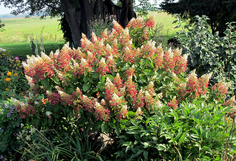 Саженцы гортензии метельчатой Pink queen прекрасно смотрятся как в одиночных, так и в групповых посадках. Это крупные кусты, которые достигают в высоту до 250 см с прочными, прямостоячими ветками. В период цветения, с июля по октябрь, растение усыпано розовыми цветами. Они собираются в большие соцветия овально-конической формы, которые достигают в длину до 30-35 см. Высаживать саженцы гортензии метельчатой Pink queen стоит в плодородную, подкисленную, влажную, хорошо дренированную почву. Места подходят практически любые, кроме полностью затененных. Сорт неприхотлив в уходе и отличается морозостойкостью.