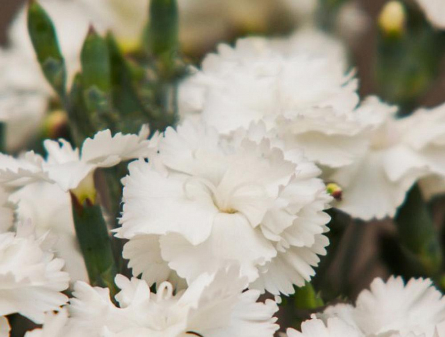 Саженцы Гвоздики Обыкновенной Ангел оф Пирити (Angel of Purity Dianthus) помогут создать на клумбе или в саду нежное белое цветущее облако. Это неприхотливые цветы, которые быстро разрастаются. Уже на второй год после посадки растение густо покрывается красивыми нежно-белыми бутонами, сквозь которые практически не просматривается зеленая масса. Цветение обильное, но непродолжительное, в течение одного месяца. Растение имеет прочный стебель и пышные густомахровые бутоны, которые в диаметре достигают 5-7 сантиметров. Такие цветы прекрасно смотрятся в букетах и является отличным дополнением для групповых посадок на клумбах и рабатках.