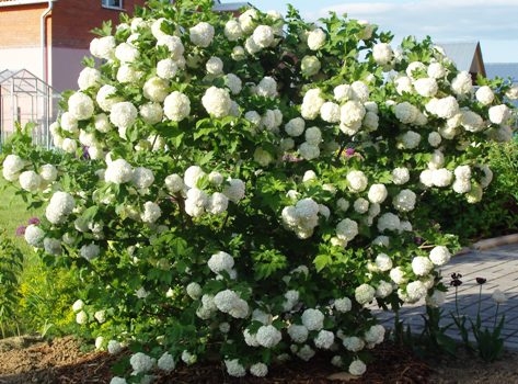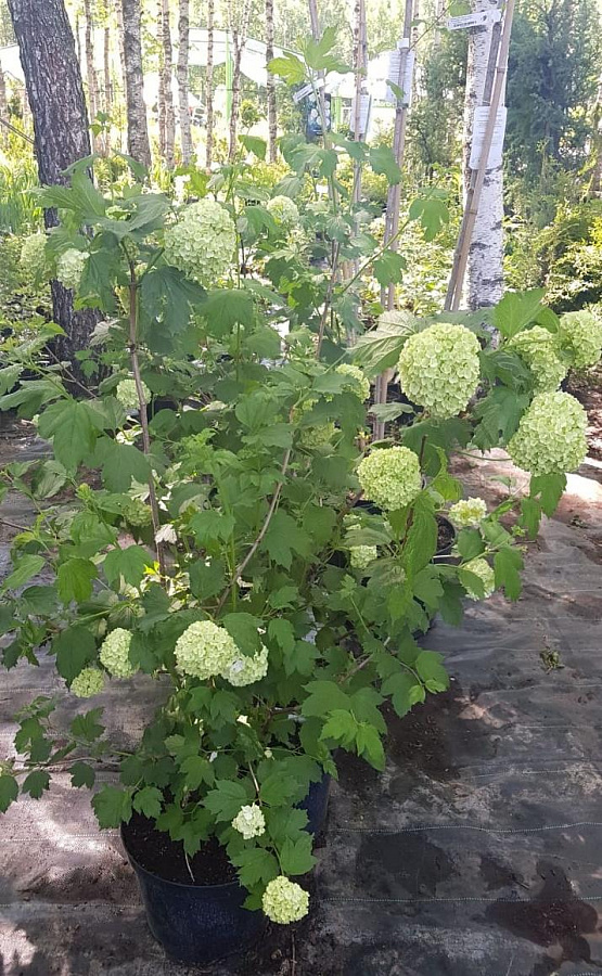 Саженцы Калины обыкновенной Розеум (Roseum) – кустарник, внешний вид которого привлечет любого садовода в первую очередь своими крупными снежно-белыми цветами, диаметр каждого из которых достигает 1,5 сантиметра. Отцветание приводит к тому, что окрас сменяется на розоватый. Основное цветение приходится на май – июнь. Для наиболее обильного цветения стоит прищипывать побеги, которые слишком активно идут в рост.