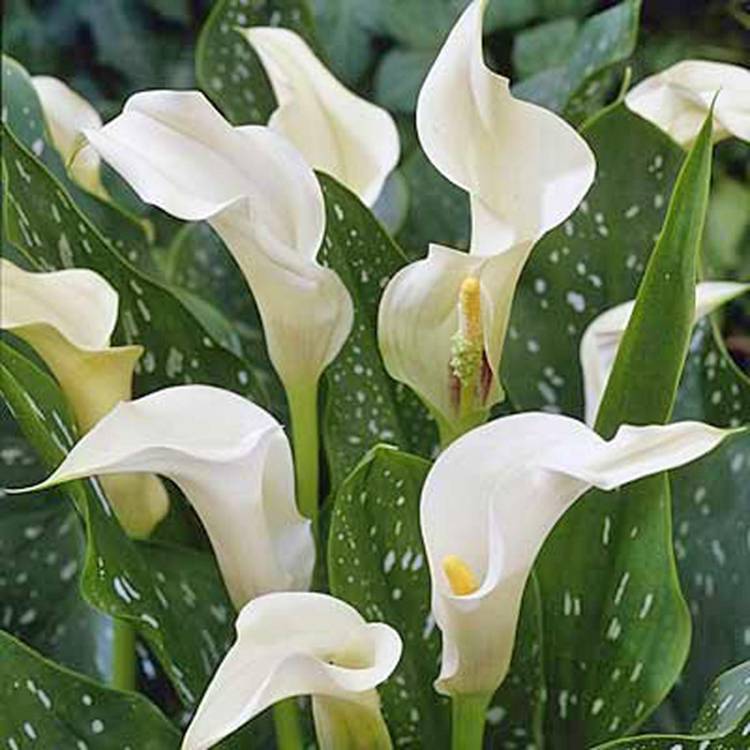 Калла белопятнистая - это изысканное растение с темно-зелеными листьями и белыми цветками, которые расцветают в марте. Ее высота достигает 50-60 см, что делает ее идеальным выбором для миксбордеров. Это растение предпочитает солнечные места и дренированные богатые почвы.