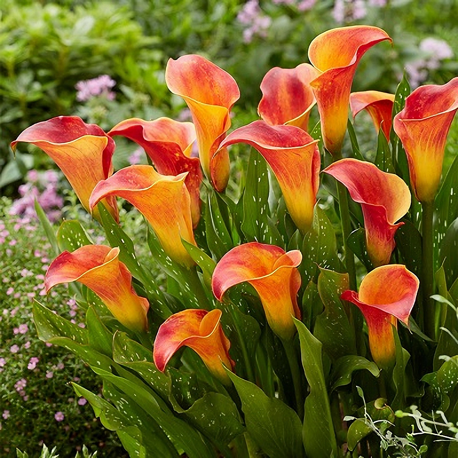 Калла треже патио - это изысканное растение с яркими желто-оранжевыми цветками, которые постепенно приобретают красноватый оттенок. Его зеленая листва с белым крапом создает весеннюю атмосферу в саду. Этот многолетник достигает высоты до 60 см и отличается своей морозостойкостью, подходя для посадки в большинстве регионов России. Калла треже патио предпочитает солнечные места и дренированные почвы, что делает его идеальным выбором для газонов, групповых и одиночных посадок.
