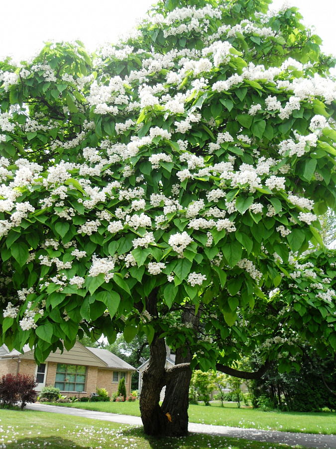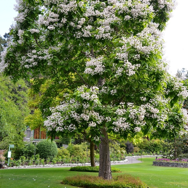 Саженцы Катальпы бигнониевидной (Catalpa bignonioides) вырастают в раскидистые деревья за короткий срок, эффектно цветут и экзотично смотрятся в парках или на участках. Средняя высота крупномеров – до 7м в средней полосе и до 20 мв более теплых широтах. Ежегодный прирост от 30 до 1 м в год. Цвести Катальпа бигнониевидная начинает в июле. Соцветия пирамидальные, длиной до 20 см, с крупными белыми цветками. После цветения остаются плоды – длинные зеленые кинжалы, темнеющие при созревании. Листья широкие, сердцевидные.