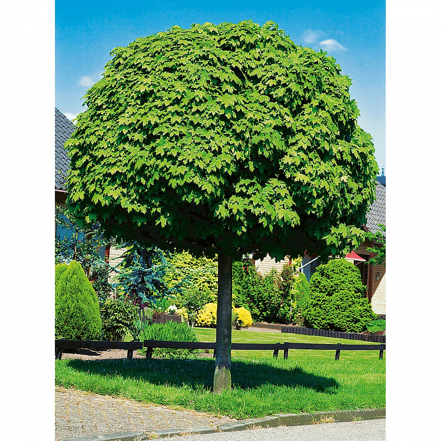 Саженцы клена остролистого Глобозум (Globosum) привлекают внимание шаровидными кронами, красивым четким рисунком листьев и декоративностью от начала цветения до глубокой осени. Весной зацветает желтыми ароматными цветами. Затем появляются красноватые листья с 5-7 лопастями, распускаются и меняют оттенок на темно-зеленый. Плодоносит клен остролистный Глобозум легкими семенами-двукрылками. Высота крупномера достигает 6 м, средний диаметр кроны 4-5 м. Достоинства: