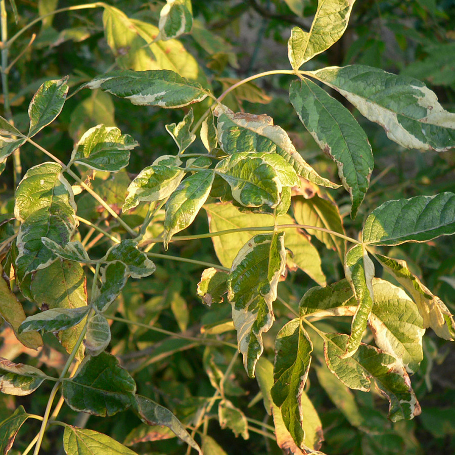Саженцы клена ясенелистного Аурэомаргината (Aureomarginata) привлекают внимание необычными перистыми листьями нежно-зеленого цвета с желтой каймой. Форма кроны рыхлая и очень живописная. Побеги усеяны пестрыми листьями по 3-7 штук, осенью меняющими цвет на золотисто-зеленый. Высота эффектного крупномера 5-7 м. Весной зрелищно наблюдать, как почки раскрываются в карминно-розовые побеги и листья, которые постепенно белеют и зеленеют. Клен ясенелистный Аурэомаргината хорошо смотрится в групповых посадках и как акцент. Цветет мелкими цветками и плодоносит крылатками с двумя лепестками.