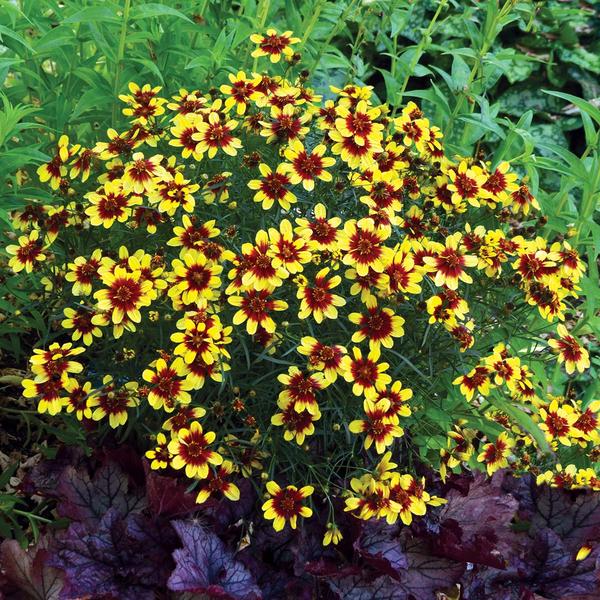 Кореопсис Bengal Tiger - это удивительное растение, которое поразит вас своей красотой и изящностью. Его яркие желтые цветы с темно-бордовой серединкой привлекут внимание всех садоводов. Этот многолетник достигает высоты до 35 см и диаметра до 60 см, что делает его идеальным выбором для групповых или одиночных посадок. Листья кореопсиса Bengal Tiger имеют светло-зеленую окраску весной, создавая яркий контраст с яркими цветами.