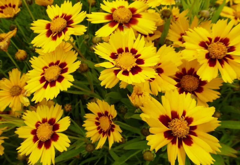 - неприхотливый в уходе и к составу почв. Цветок простой формы, но край лепестков резной, а их золотисто-желтый оттенок с бордовым основанием прекрасно гармонирует с сочно-зеленой листвой. Кореопсис ланцетовидный Бэби Голд в жаркие дни требует полив, так цветущий куст дольше сохраняет свой декоративный вид.