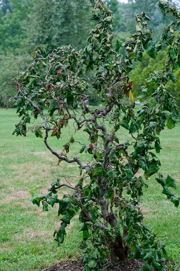 Саженцы лещины обыкновенной Конторта (Contorta) – вырастут в необычное дерево с искривленными ветвями. Крупномеры выглядят экзотично в любой сезон: зимой и весной поражают графикой, летом и осенью создают впечатление вьющейся кроны. Цветет дерево длинными сережками, которые держатся после опадания листвы и эффектно смотрятся на искривленных голых ветвях. Листья округлые, лопастные, светло-зеленые летом и желтеющие осенью. Высота взрослой лещины обыкновенной Конторта 3 м.