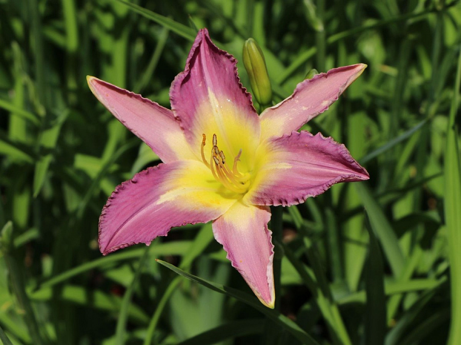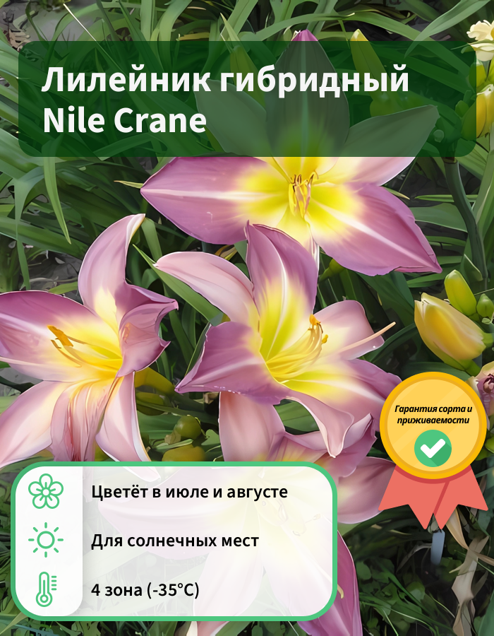 Саженцы лилейника гибридного Нил кран (Hemerocallis hybrida, Nile Crane) высаживают в уютном месте миксбордера, клумбы, газона. Предпочитает расти на солнце, но мирится с полутенью. Для высадки молодого растения выбирают влажную, дренированную почву. В народе цветок называют просто «лилия». Это очень декоративный, неприхотливый многолетник. Высота взрослого растения 70 сантиметров. В июле распускается лилово-розовыми цветами с желтым горлышком и волнистыми краями, диаметром до 14 сантиметров. Цветение длится месяц. Лилейник источает легкий приятный аромат, привлекающий пчел и бабочек.