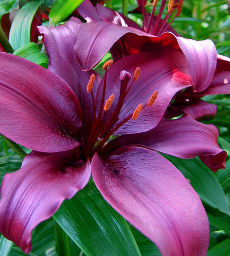 Лилии темно-фиолетового, винного цвета. Лепестки немного изогнуты, перламутровые. Пик цветения приходится на середину лета. Азиатский сорт неприхотлив в выращивании, не боится низких температур, не болеет. Хорошо себя чувствует на солнце и в полутени. Предпочитает нейтральные почвы.