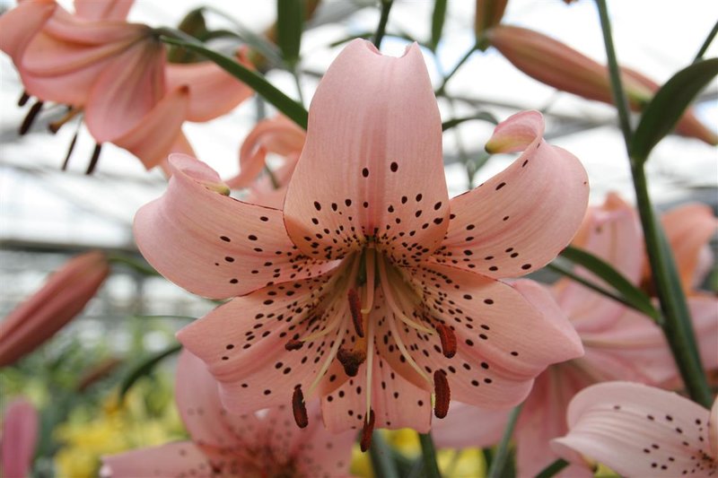 • Окраска цветка : палево-розовый с крупным, частым темно-розовым крапом, лепестки подкручены вниз