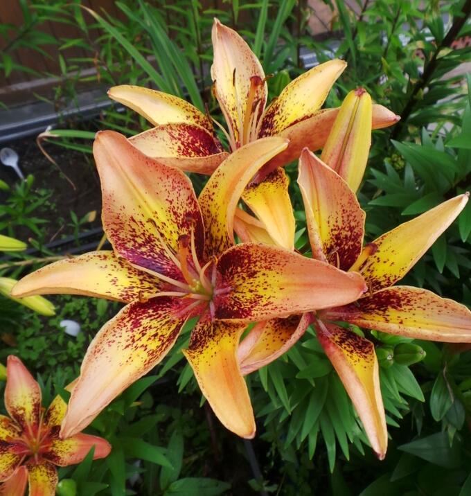 Луковицы Лилии азиатской Танго Голден Браун (Lilium asiatic Tango Golden Brown) отлично подойдёт любителям цветового разнообразия. Сорт отличается крупными цветками с классической звездчатой формой. Обращает на себя внимание пестрая расцветка, напоминающая перья экзотической птицы. На лепестках желтого цвета густо рассыпан бордовый крап, кайма у лепестков почти медного цвета. На одном стебле (высотой около метра), распускается от 5 до 7 бутонов одновременно. Голден Браун радует обильным цветением, быстрым размножением и неприхотливостью.