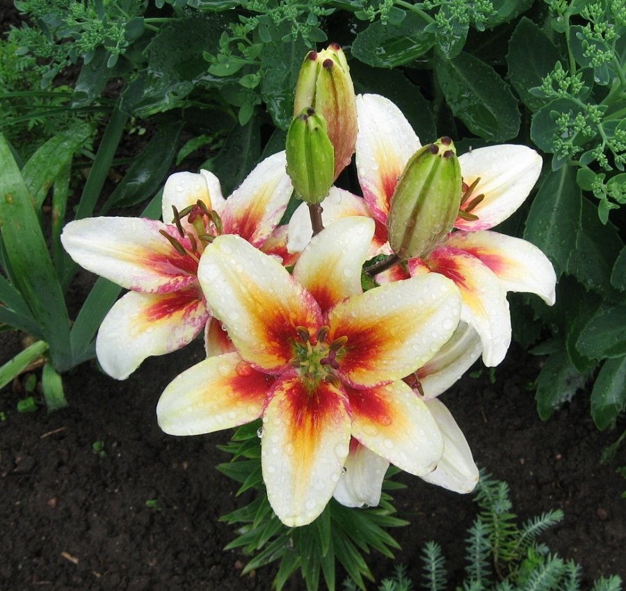 • Окраска цветка : Трехцветный сорт. Белый, с малиново-красными мазками поверх желто-оранжевых мазков по центру 2/3 лепестков. Пыльники коричневые.