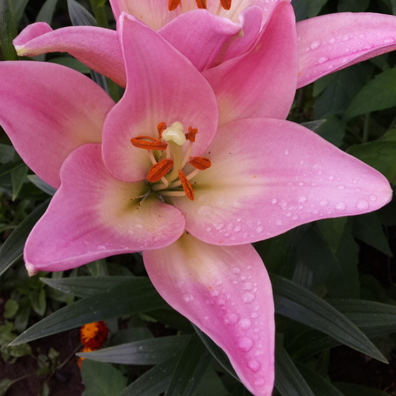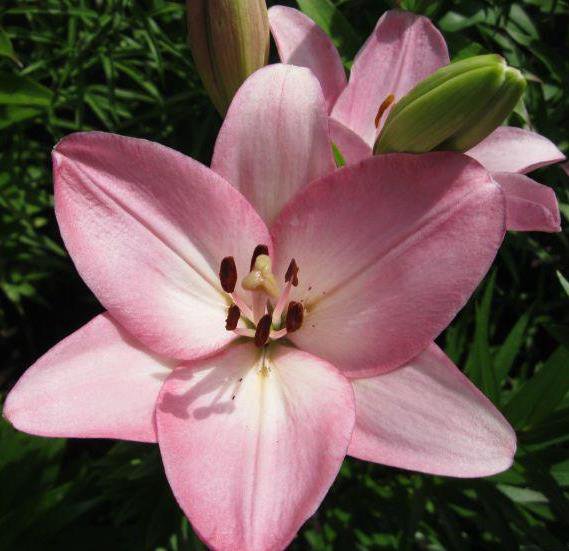 • Окраска цветка : Перламутрово-розовая с белым центром, темно-розовые пыльники и редкий мелкий крап у основания