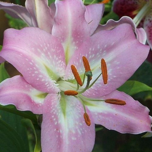 • Окраска цветка : розовато-белый с редким крапом и оранжевыми тычинками, гофре по краю