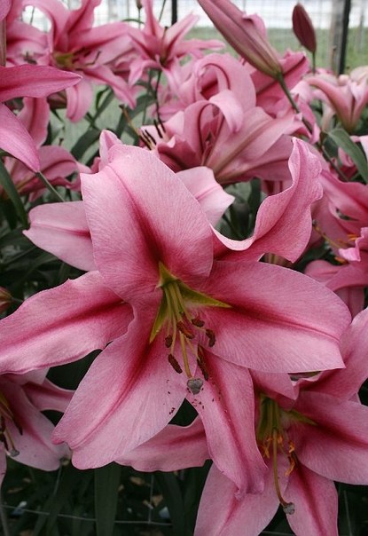 Цветки крупные, сиренево-розовые с красноватой полоской по центру. Лилии немного опущены вниз. Период цветения приходится на вторую половину июля. Цветы располагаются на мощных темно-зеленых стеблях. Сорт Пепл Кинг может использоваться на срез, долго сохраняет свежесть в букетах.
