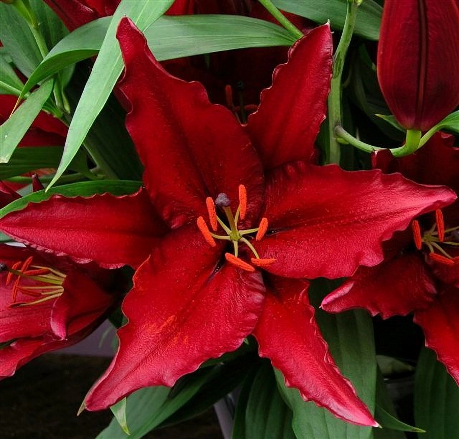 Луковицы лилии восточной Файрболт (Lilium hybrid oriental Firebolt) обязательно придутся по вкусу ценителям глубоких оттенков. Соцветия у этого сорта крупные (до 25 см в диаметре), их лепестки окрашены в насыщенный винный цвет с добавлением черных вкраплений. Они появляются поздно, в августе и в сентябре, когда остальные цветы в саду уже отцветают. Лилия Файрболт особенно эффектно смотрится в пышных букетах или цветочных массивах, при этом расставляет правильные акценты. Ее легко выращивать в домашних условиях. Достаточно периодически поливать ее и подкармливать минеральными удобрениями, а зимой укрывать от морозов, чтобы цветы получались особенно яркими и крупными.