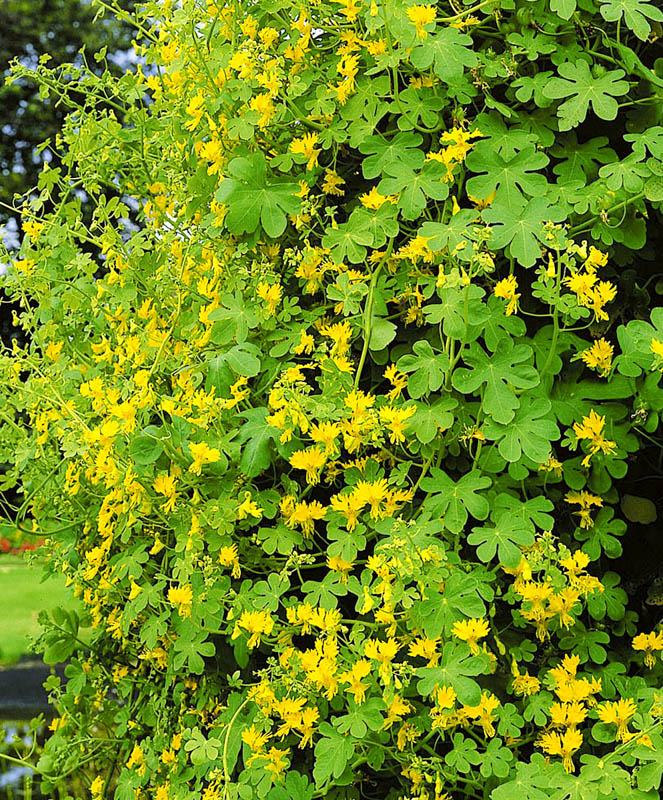 Семена настурции обыкновенной «Канарская лиана» (Tropaeolum majus Nanum) высевают в мае непосредственно на постоянное место в лунки по три штучки. При температуре почвы +18 градусов всходы появляются на 20-25 день. Для более раннего цветения можно выращивать культуру рассадным способом, высевая семена в горшочки в середине апреля. Стебли растения достигают до 200 см длиной, светло-зеленые. Листья небольшие, пяти-семи раздельные. Цветки мелкие, канареечно-желтые с гофрированными лепестками и зелеными шпорцами. Настурция иноземная «Канарская лиана» прекрасно подходит для вертикального озеленения сада, беседок, балконов.