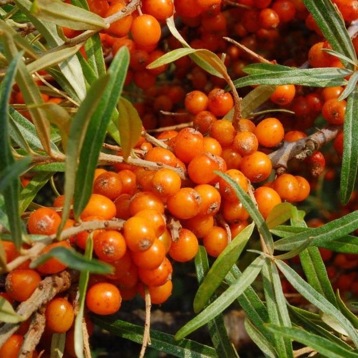 Саженцы облепихи Hippophae rhamnoides развиваются в многоствольные кустарники, имеющие не только декоративные свойства, но и очень полезные вкусовые. Они ценны и своими целебными свойствами. Растения 1-3 метров высотой покрыто длинными колючками. Листочки узкие светлые, почти серые. Цветет желтенькими цветами в конце весны. А осенью появляются и сами витаминизированные ягоды-костянки ярко–оранжевого цвета. Плоды облепихи Hippophae rhamnoides обладают свойствами: