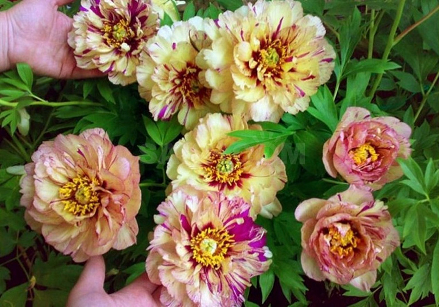 Рассада пиона ИТО Лоллипоп (Lolliepop): выносливый сорт добавит в сад свежесть и задор, благодаря пестрым махровых цветкам. На лепестках кремово-лимонного цвета как будто небрежной кистью нанесли яркие малиновые полосы. На каждом побеге может образовываться по несколько бутонов. Резная узкая листва сохраняет декоративность до наступления холодов. Пышные кусты достигают высоты 90 см. Часто завязываются семена. Особенности посадки пиона Лоллипоп: