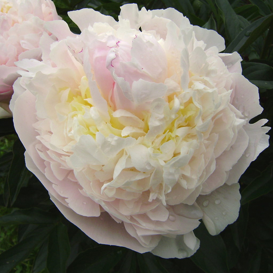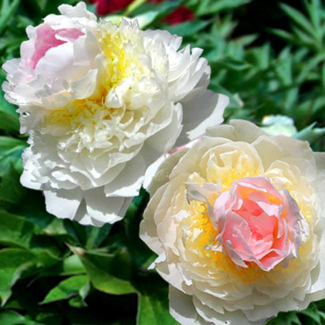 Пион сорта Blush Queen (Блаш Квин) имеет махровые розовидные большие цветы необычного оттенка. Лепестки по краям кремово-белые с примесью желтизны, а в центре они постепенно переходят в нежно-розовый цвет. Для кустарника характерен средний срок цветения. Кустарники часто становятся украшением участка при оформлении его дизайна. У сорта Блаш Квин большие соцветия и декоративные резные листья. Кустарник не прихотлив к условиям произрастания. Он нормально переносит понижение температуры воздуха. Но для него важно обилие света. Особенностью пиона следует считать то, что он плохо реагирует на пересадку.