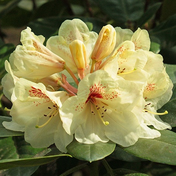 Рододендрон гибридный "Голдбукет" - это великолепное растение с желто-кремовыми цветками, украшенными красным пятнышком внутри венчика. Его зеленая листва радует глаз в течение всего сезона, а его компактный размер (высотой до 100 см и диаметром до 120 см) позволяет разместить его как на газоне, так и в групповых посадках или использовать для создания живой изгороди.