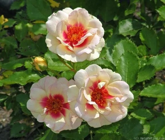 Роза парковая Bulls Eye - это великолепное растение с кремовыми цветами, украшенными ярко-фиолетовым или клюквенно-красным пятном в центре. Этот сорт розы, созданный оригинатором Питером Джеймсом в Великобритании в 2011 году, поражает своей красотой и изяществом. Роза Bulls Eye достигает высоты до 120-160 см и цветет в июле, августе, сентябре и октябре, радуя глаз своими прекрасными цветами.