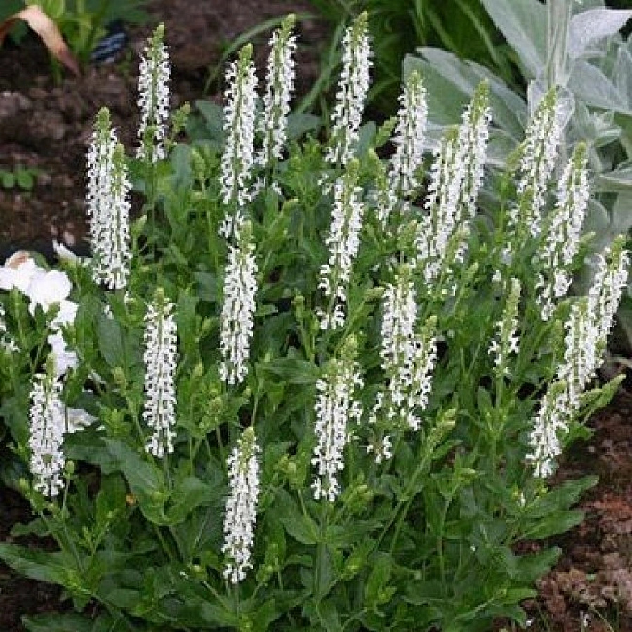 Сальвия дубравная шнеехёгль - это удивительное растение с белыми цветками, которое поразит вас своей изящностью и неповторимым очарованием. Ее стебель прочный и прямой, достигает высоты до 60 см, что делает ее идеальным выбором для альпинариев, газонов, групповых посадок и каменистых горок. Листья сальвии дубравной имеют зеленую окраску и создают красивый фон для ярких белых цветков.