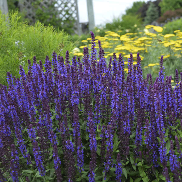 Саженцы Шалфея дубравного Нью Дименсион блю (New Dimension Blue Salvia nemorosa) высаживают на клумбы, миксбордеры, рабатки, не редко их можно увидеть в кашпо и декоративных горшочках. Декоративная культура не нуждается в сложном уходе, за исключением солнечного цвета и дренированной почвы. Средняя высота куста — 50 сантиметров, мелкие синие цветочки собраны в колосообразные соцветия, листья зеленые. Пряный аромат привлекает прохожих и насекомых, в частности пчел и бабочек. Первоклассный медонос отличается длительным периодом цветения — с первых дней лета до осенних холодов.