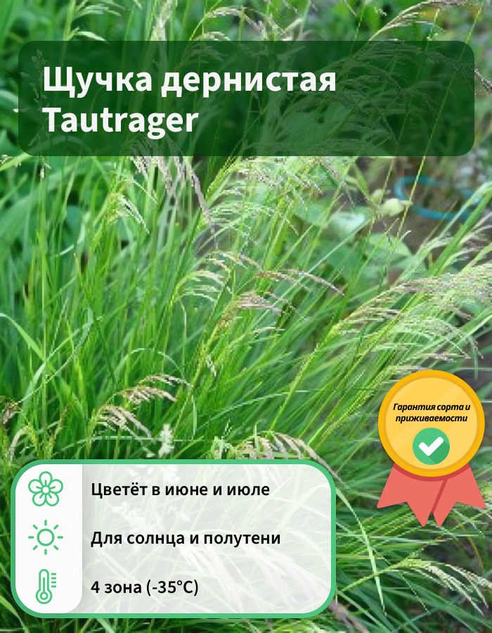 Рассада щучки дернистой Таутрагер (Tautrager) растёт на любых почвах. Цветёт в конце июня. Во время солнцепёка может покрыться ржавчиной. Замечательно себя чувствует в полутени. Меняет цвет по мере созревания. По высоте куст низкорослый – не превышает 90 см. В диаметре, в лучшем случае, около 60 см. Цветки имеют голубоватый оттенок, со временем приобретают жёлтый. Сочетается с цветами, имеющими другую форму, например, розами, лилейниками, эхинацеями и хостами. Характеристика сорта: многолетнее растение; высота: от 60 до 90 см; период цветения: июнь-июль.