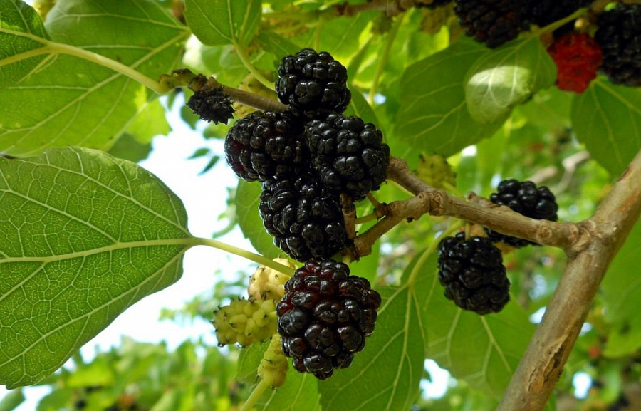 Саженцы шелковицы черной очень популярны как неприхотливое ягодное дерево, способное без особо сложного ухода произрастать и плодоносить по всей умеренной климатической полосе. Тутовое дерево популярно из-за сладких, с насыщенным вкусом, ароматных черного цвета ягод, которые пригодны к употреблению как в свежем, так и переработанном виде, а большое количество веществ с антиоксидантной активностью делает их еще и очень полезными для здоровья. Имеет выраженный характерный приятный аромат. Сложностей в уходе за черной шелковицей нет, так как дерево достаточно неприхотливо.