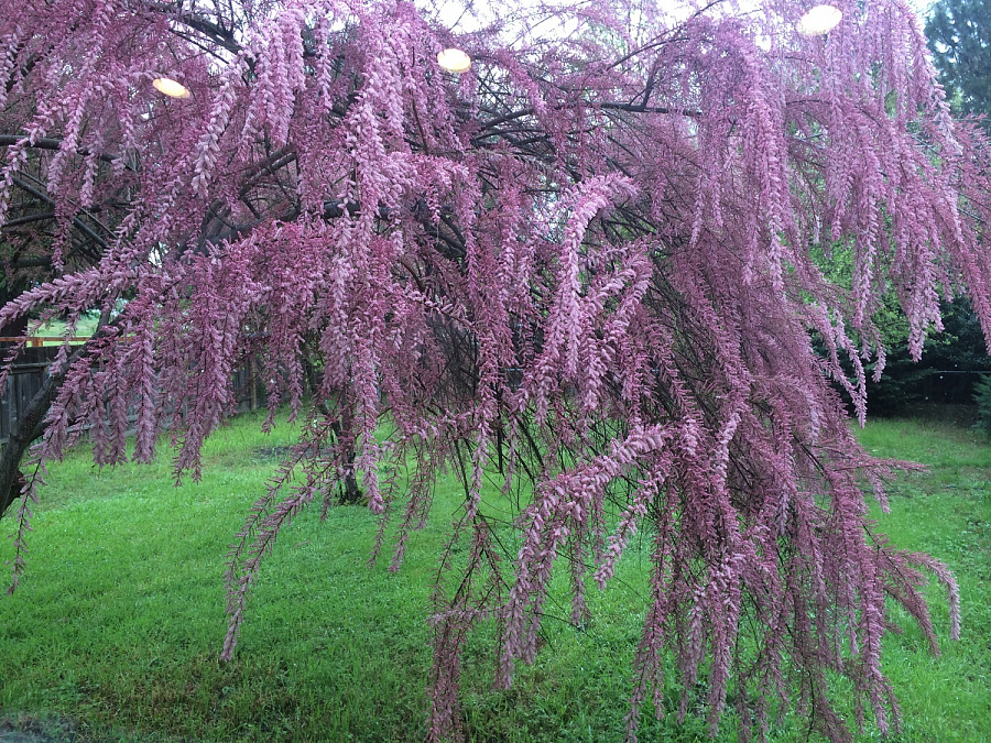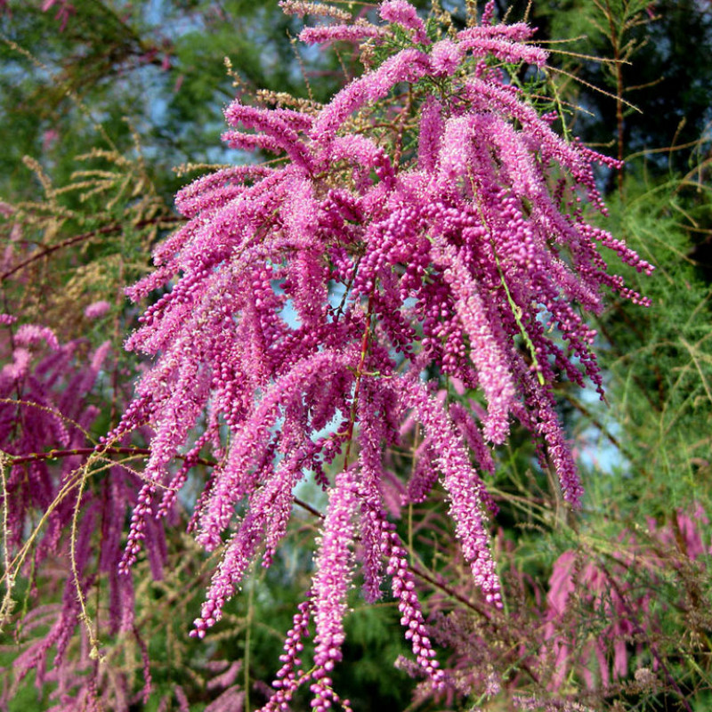 Эффектный пряморастущий кустарник, до 3 м высотой, с тонкими, сизоватыми или зеленоватыми ветвями и красноватыми однолетними побегами. Листья узкие, шиловидные, до 1,5 мм длиной, с концами загнутыми к побегу. Цветки розовые, в густых, сложных кистях, до 30 см длиной. Цветет с июня по сентябрь.
