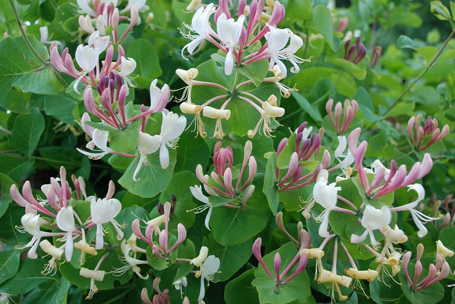 Саженцы жимолости Каприфоль можно сформировать как куст при посадке крупномера в лунку или как лиану для вертикального озеленения при посадке в траншею. Растение образует большую массу блестящих зеленых листьев на коротких черешках. Цветет жимолость Каприфоль в мае-июне ароматными кремово-розовыми цветами. Используется в фармакологии.